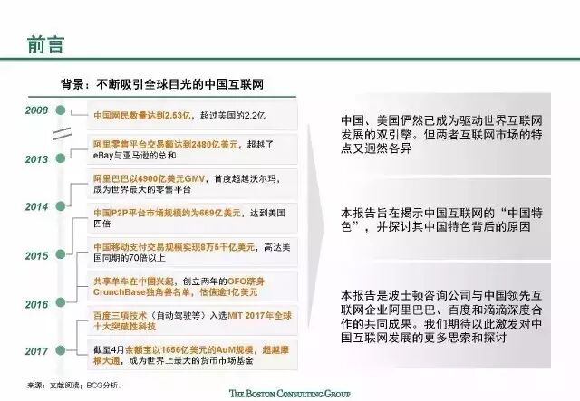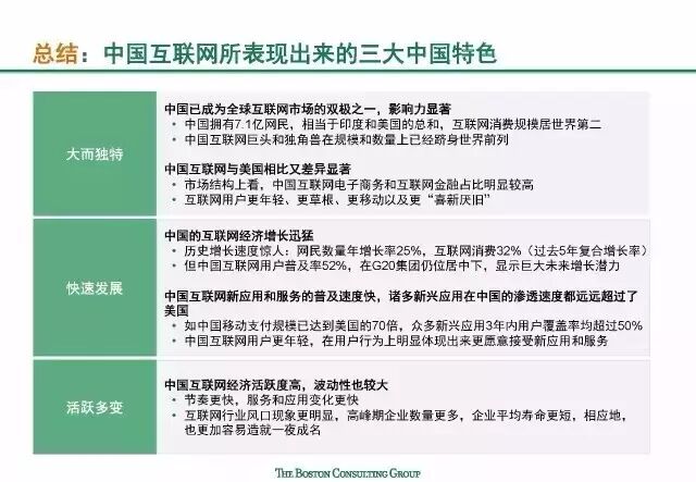 因此,在关注的目光背后,世界对中国互联网充满了无限的好奇:中国互联网如何在短时间内取得飞跃?它呈现出哪些独一无二的中国特色?这些特色从何而来,未来又将何处去?为了回答这些问题,由波士顿咨询公司(BCG)牵头,联合阿里研究院、百度发展研究中心和滴滴政策研究院共同进行调研并撰写了报告《解读中国互联网特色》。
