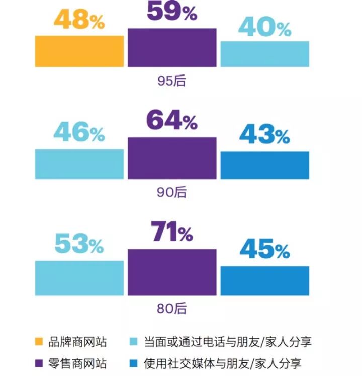 在获取商品信息时,95后更乐于浏览品牌商网站,尤其是选择服装、电子产品和食品杂货时。