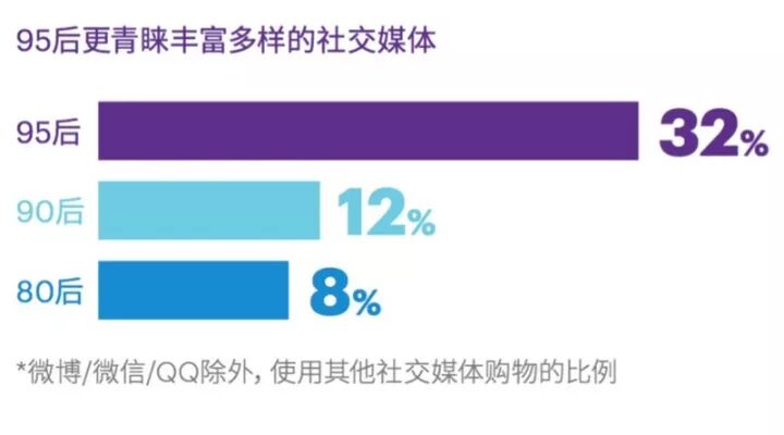 与80、90后主要聚焦微信、微博和QQ空间不同,约三分之一的95后青睐更丰富的社交平台,比如直播类、视频类平台。