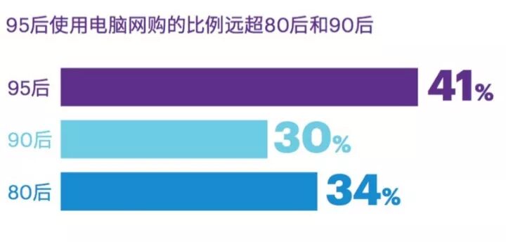 依赖网购的95后比例高于80后和90后,特别是服装类。有意思的是,移动端不再是王道,95后更青睐的网购工具是电脑而不是手机。
