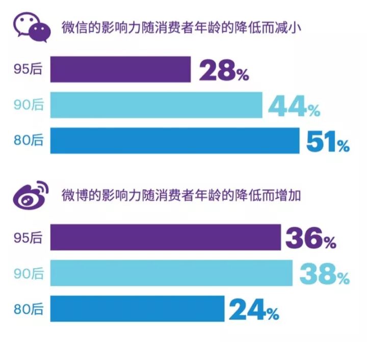 而通过社交媒体购物方面,具体平台的影响力呈现出较大差异:微信的影响力随年龄降低而减小,微博则相反。